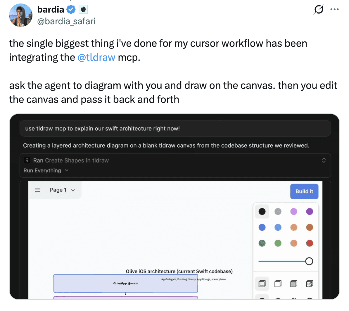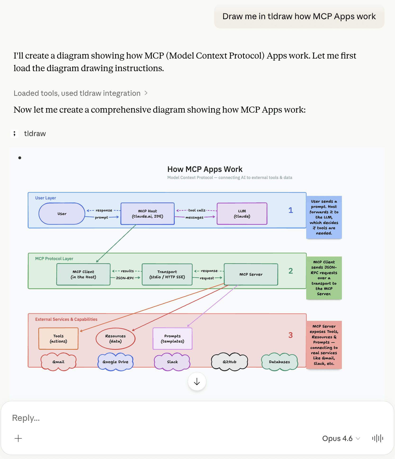 Once you've installed the tldraw MCP app, you can put it to work: diagram your codebase architecture, walk through a PR, or sketch out a system design together.