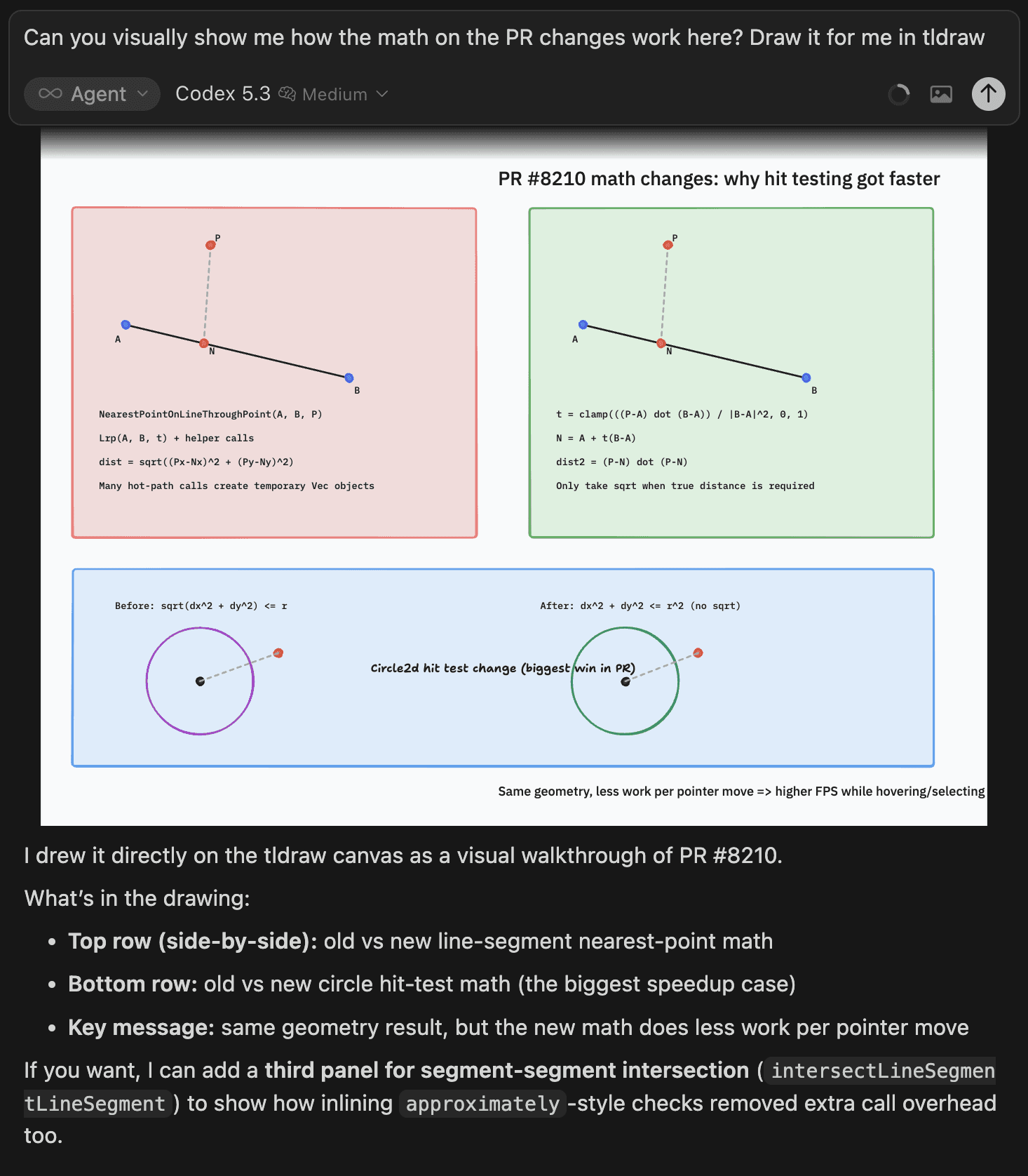 Last week, while working on an issue that would change how tldraw calculates curves, I asked the Cursor agent to show me how the change worked—visually. Cursor spun up a tldraw to show me, with the old approach on the left, the new approach on the right, and annotations to highlight the key optimization. I had the idea in a moment and was able to give the model much better steering as we continued.